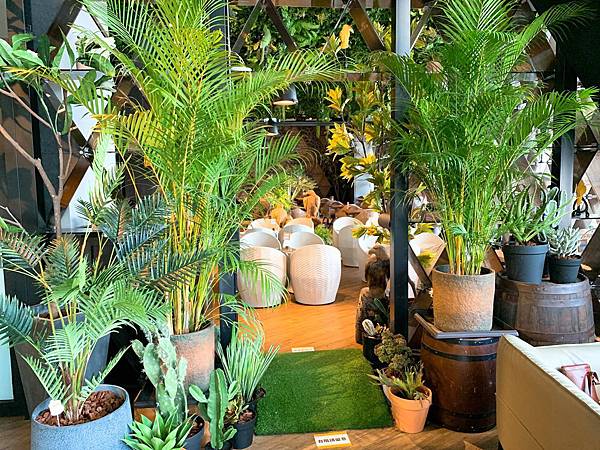 木頭地板上放滿了許多盆栽,大自然體驗感直接上升。