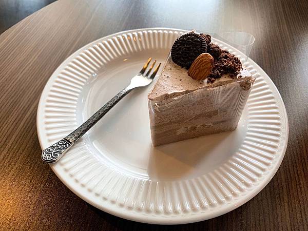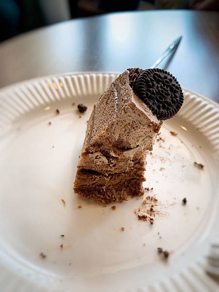 蛋糕上面有些巧克力碎片、一塊OREO和一顆堅果,